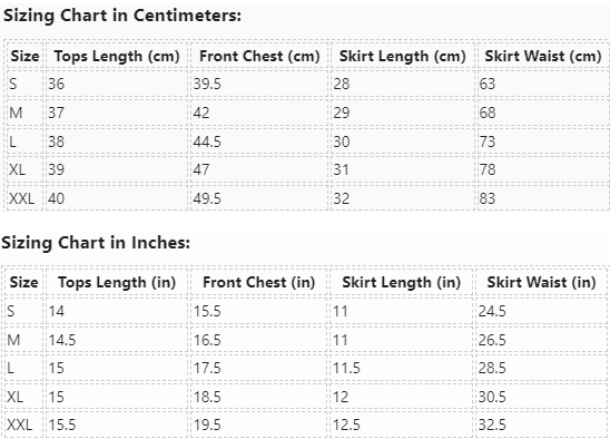 | Size | Tops Length (cm) | Front Chest (cm) | Skirt Length (cm) | Skirt Waist (cm) |