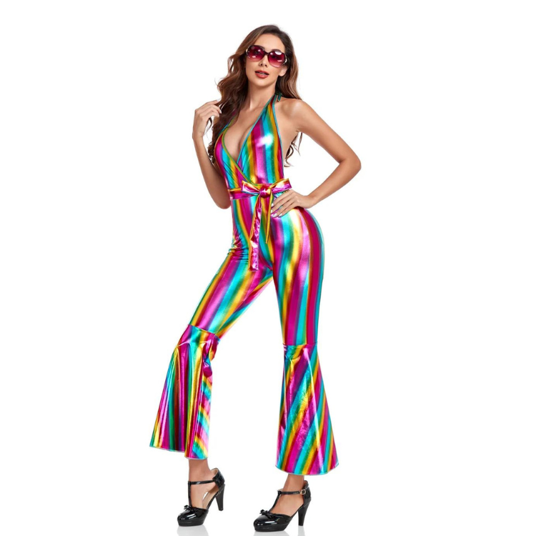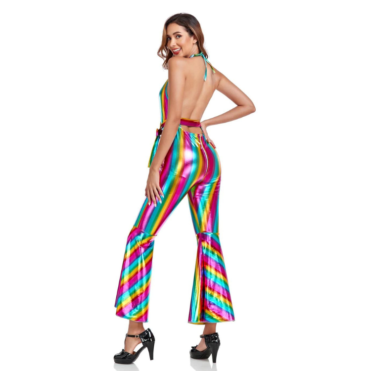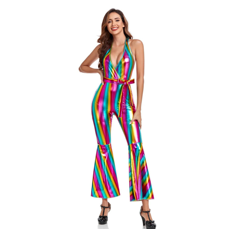 This jumpsuit isn't just a piece of clothing; it's an expression of pride, a celebration of identity, and a throwback to an era when the dance floor was a place of liberation. It's perfect for those who dare to stand out and shine bright, offering both style and a statement. Whether you're dancing under the disco ball or flaunting your style at a pride event, you'll radiate confidence, sex appeal, and unapologetic boldness.