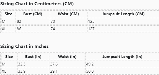 | Size | Bust (CM) | Waist (CM) | Jumpsuit Length (CM) |