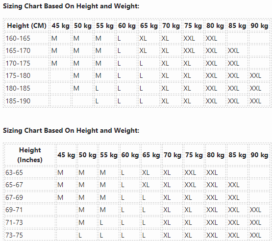 Sizing Chart Based On Height and Weight: