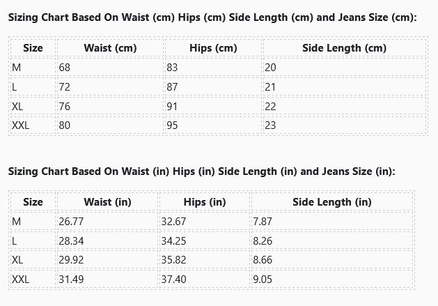 Sizing Chart Based On Waist (cm) Hips (cm) Side Length (cm) and Jeans Size (cm):