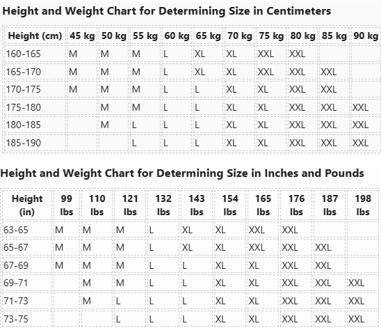 | 170-175 | M | M | M | L | L | XL | XL | XXL | XXL | |