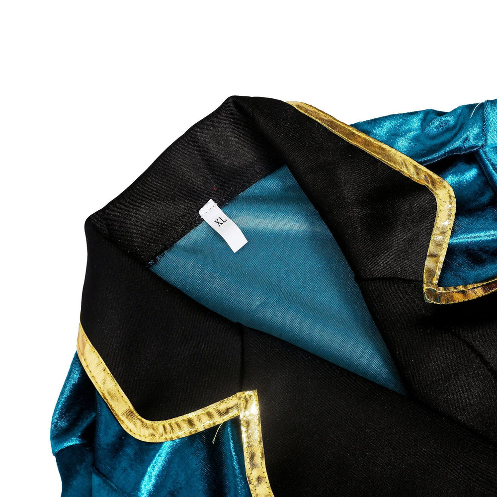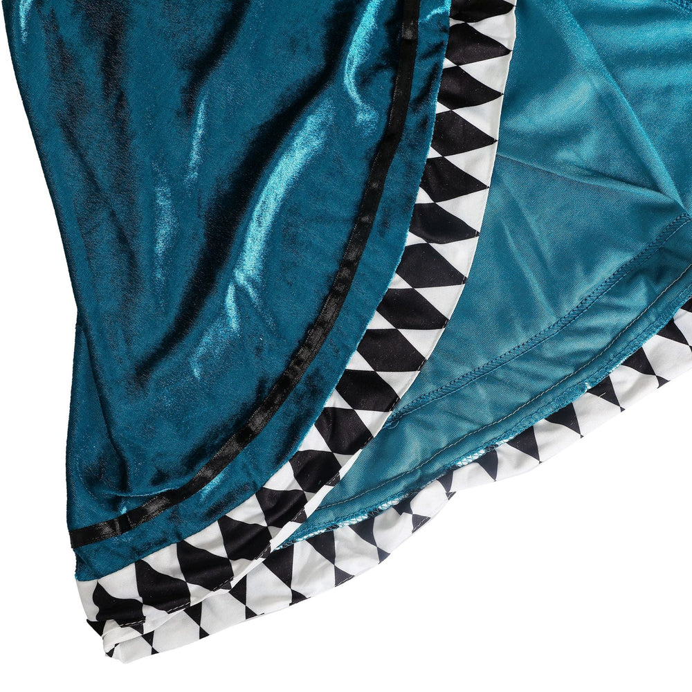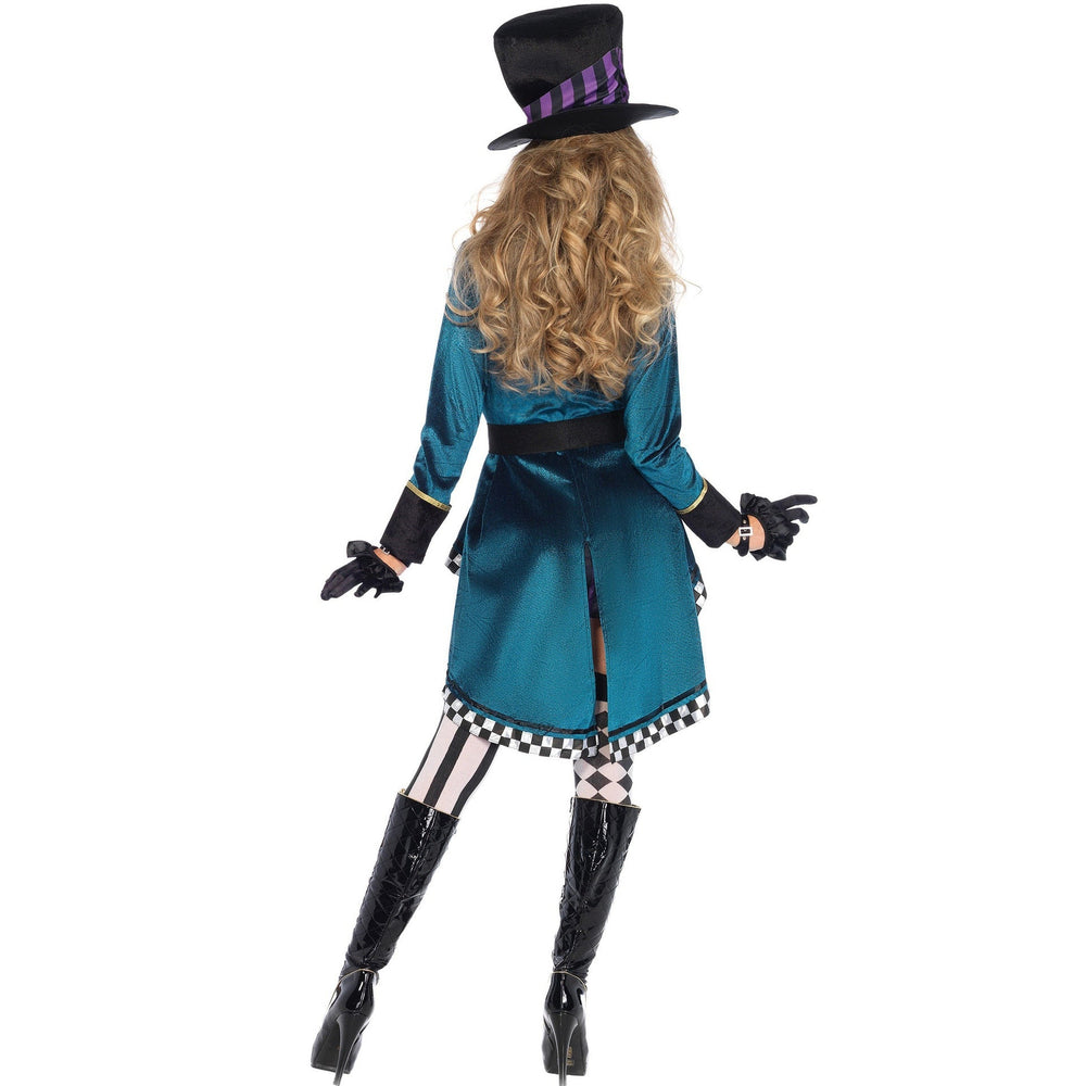 The gorgeous teal coat and skirt are accented with gold, stripes, and harlequin patterns. The coat comes with a belt, and the ensemble also includes gloves and bow tie, and, of course, the Mad Hatter’s hat, without which this costume would be incomplete. The hat even contains the 10/6 reference, which aficionados of the literary work or any of its many film adaptations will appreciate.