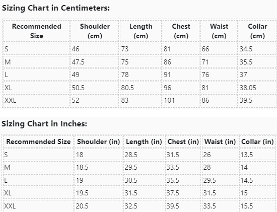 | Recommended Size | Shoulder (cm) | Length (cm) | Chest (cm) | Waist (cm) | Collar (cm) |