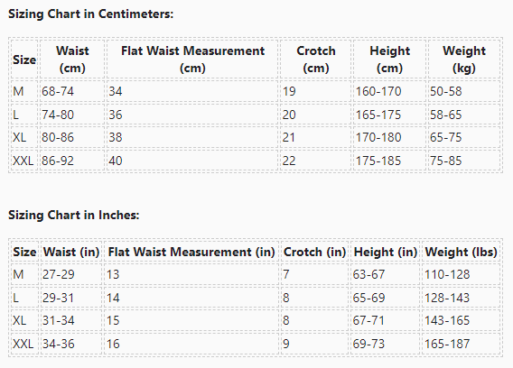 | Size | Waist (cm) | Flat Waist Measurement (cm) | Crotch (cm) | Height (cm) | Weight (kg) |