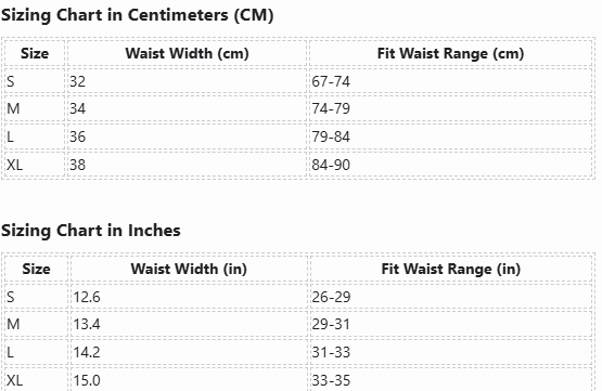 | Size | Waist Width (cm) | Fit Waist Range (cm) |