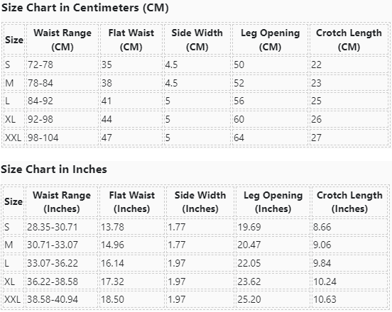 | Size | Waist Range (CM) | Flat Waist (CM) | Side Width (CM) | Leg Opening (CM) | Crotch Length (CM) |