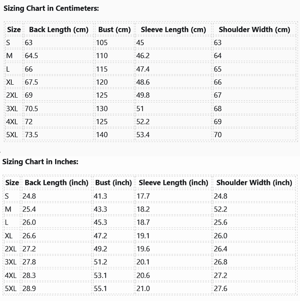 | Size | Back Length (cm) | Bust (cm) | Sleeve Length (cm) | Shoulder Width (cm) |