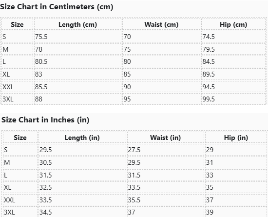 | Size | Length (cm) | Waist (cm) | Hip (cm) |