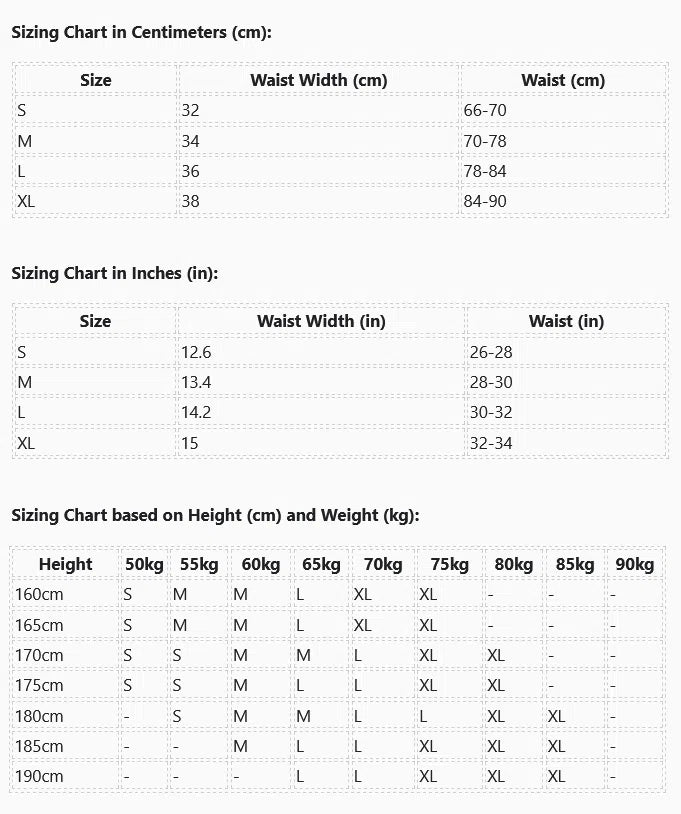 Sizing Chart Based on Height (cm) and Weight (kg):