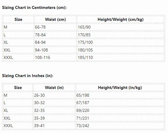 | Size | Waist (cm) | Height/Weight (cm/kg) |