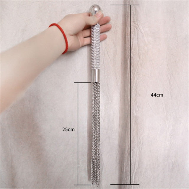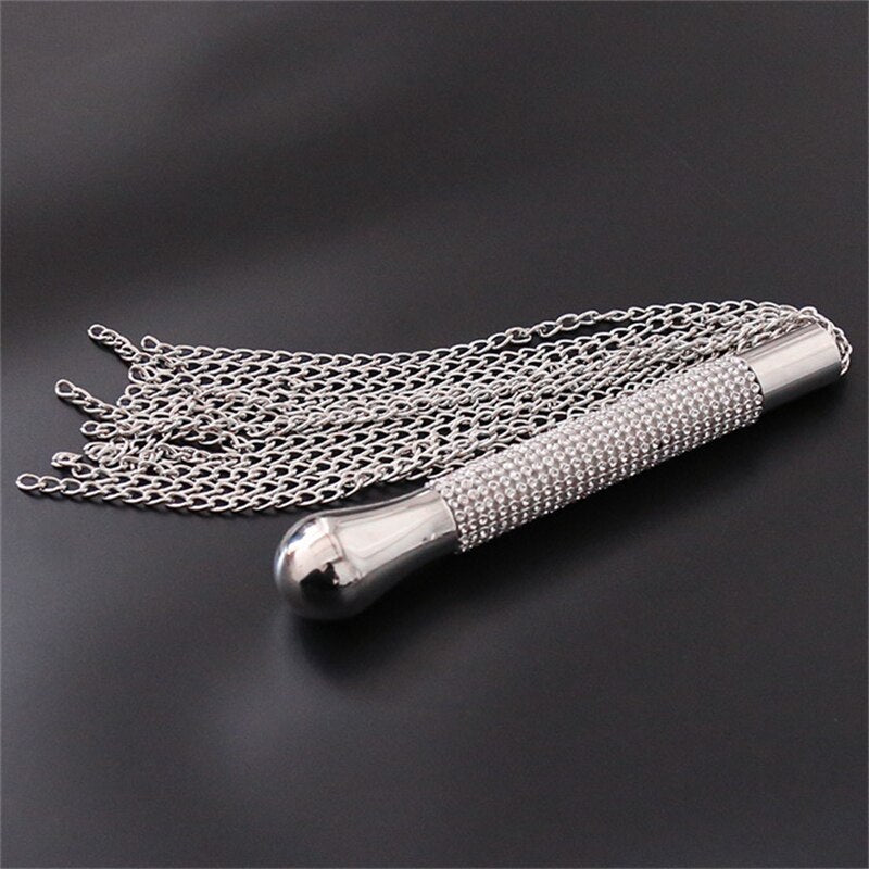 This flogger-style whip is made of stainless steel. The handle is solid steel, while the strands are individual chain links. It's great for those with a metal kink and people who prefer substantial force in impact play. It'll likely leave marks and welts, so prepare for that as well.