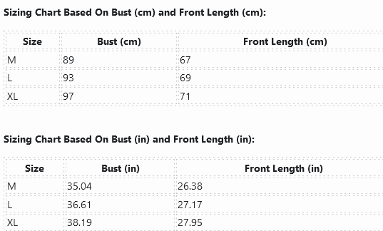 Sizing Chart Based On Bust (cm) and Front Length (cm):