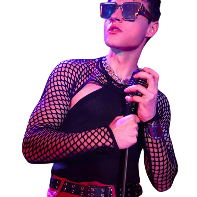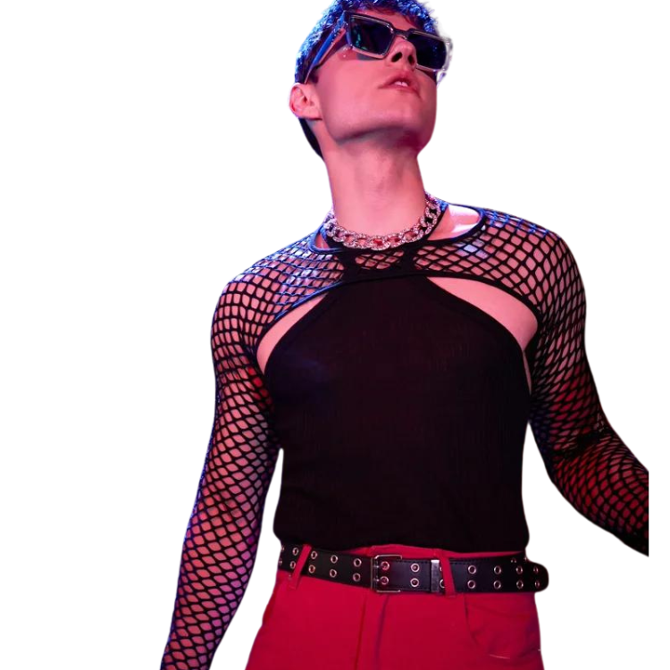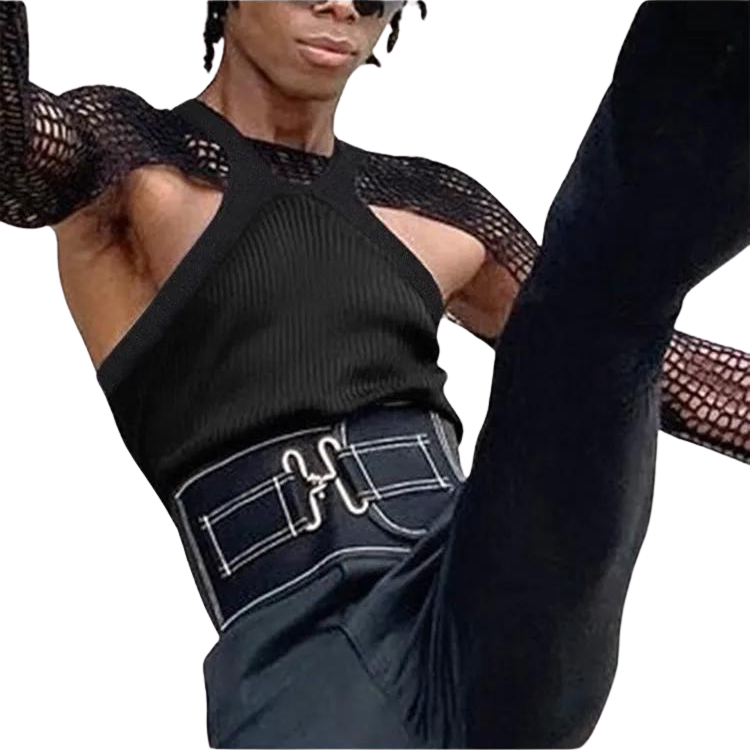 Crafted for the bold hearts within the queer community, this set is a tribute to iconic gay pop culture, blending sass with sophistication. The mesh vest, a masterpiece of flirtation, pairs seamlessly with the body-hugging tee, creating an ensemble that whispers sweet nothings about your boldness. It's an outfit that doesn't just say you've arrived; it screams it, turning sidewalks into runways and transforming everyday moments into scenes from your own blockbuster life.