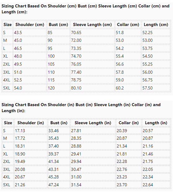 Sizing Chart Based On Shoulder (cm) Bust (cm) Sleeve Length (cm) Collar (cm) and Length (cm):