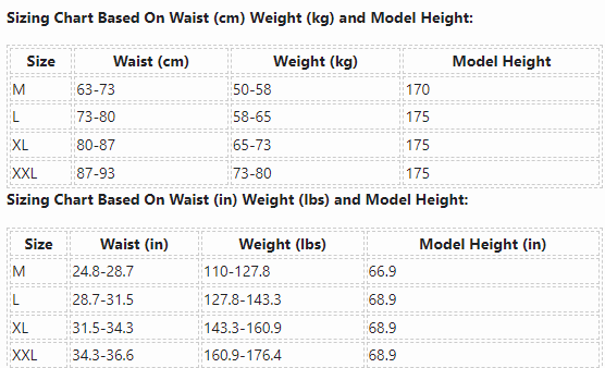 Sizing Chart Based On Waist (cm) Weight (kg) and Model Height: