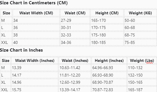 | Size | Waist Width (CM) | Waist (CM) | Height (CM) | Weight (KG) |