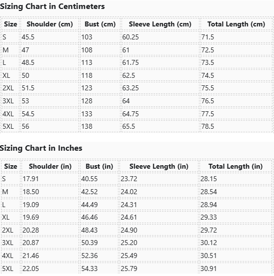 | Size | Shoulder (cm) | Bust (cm) | Sleeve Length (cm) | Total Length (cm) |