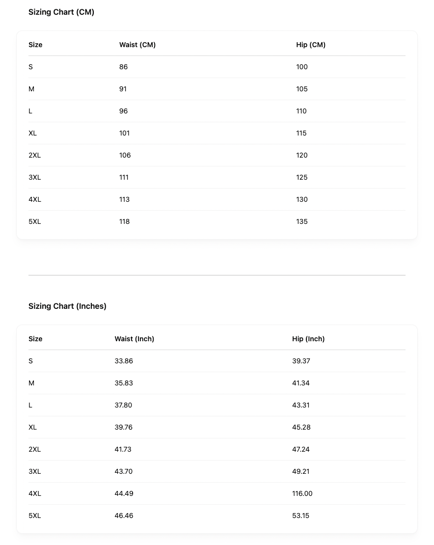 | Size | Waist (CM) | Hip (CM) |