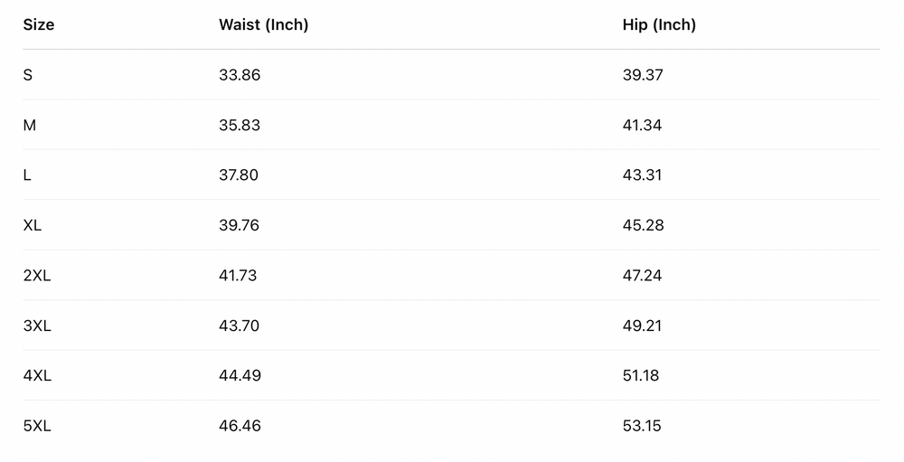 | Size | Waist (Inch) | Hip (Inch) |