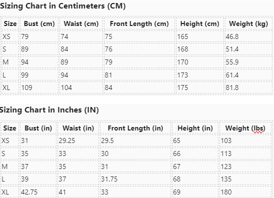 | Size | Bust (in) | Waist (in) | Front Length (in) | Height (in) | Weight (lbs) |