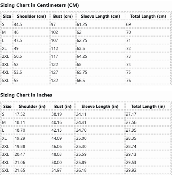 | Size | Shoulder (cm) | Bust (cm) | Sleeve Length (cm) | Total Length (cm) |