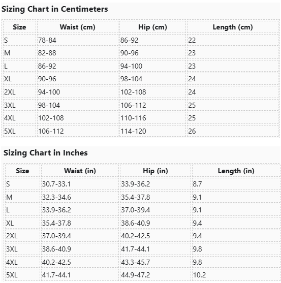 | Size | Waist (in) | Hip (in) | Length (in) |
