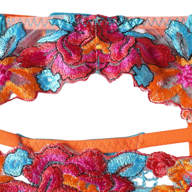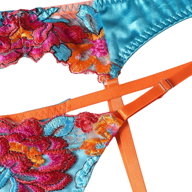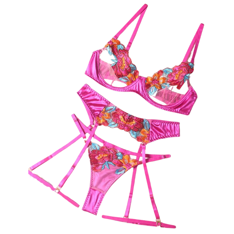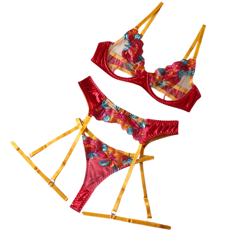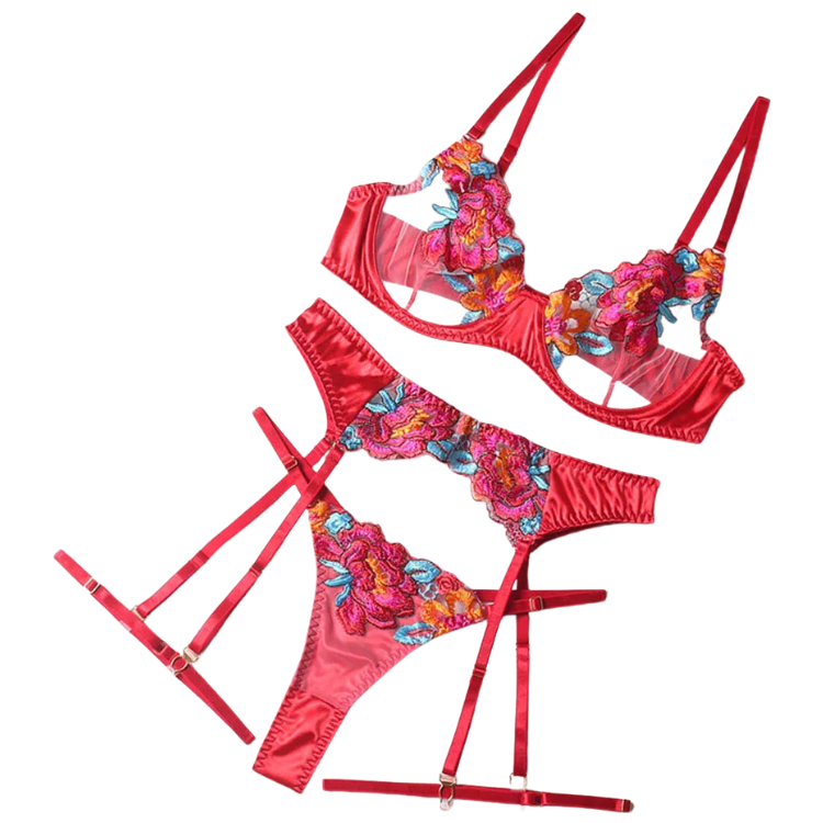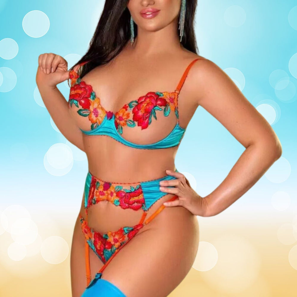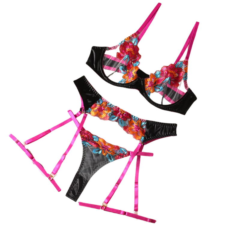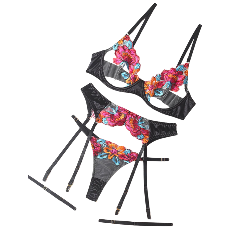 This enchanting ensemble draws inspiration from the delicate dance of flowers in the breeze, transforming that natural elegance into a form-fitting masterpiece that highlights every asset with its intricate lace detailing and flirtatious cutouts. The plunging neckline serves as a bold declaration of confidence, while the whisper-thin lace whispers secrets of nights filled with passion and liberation.