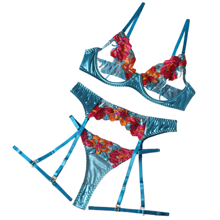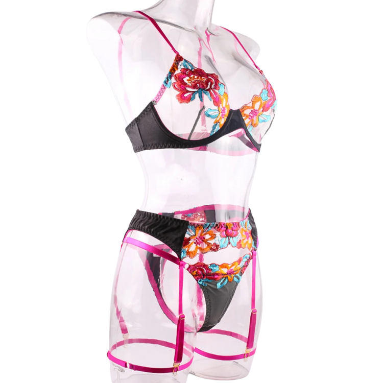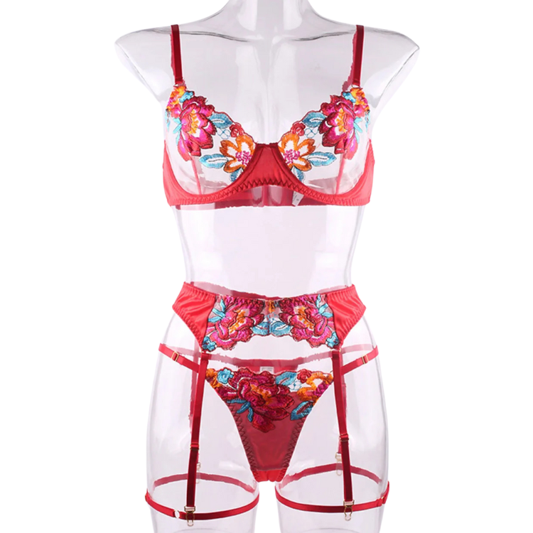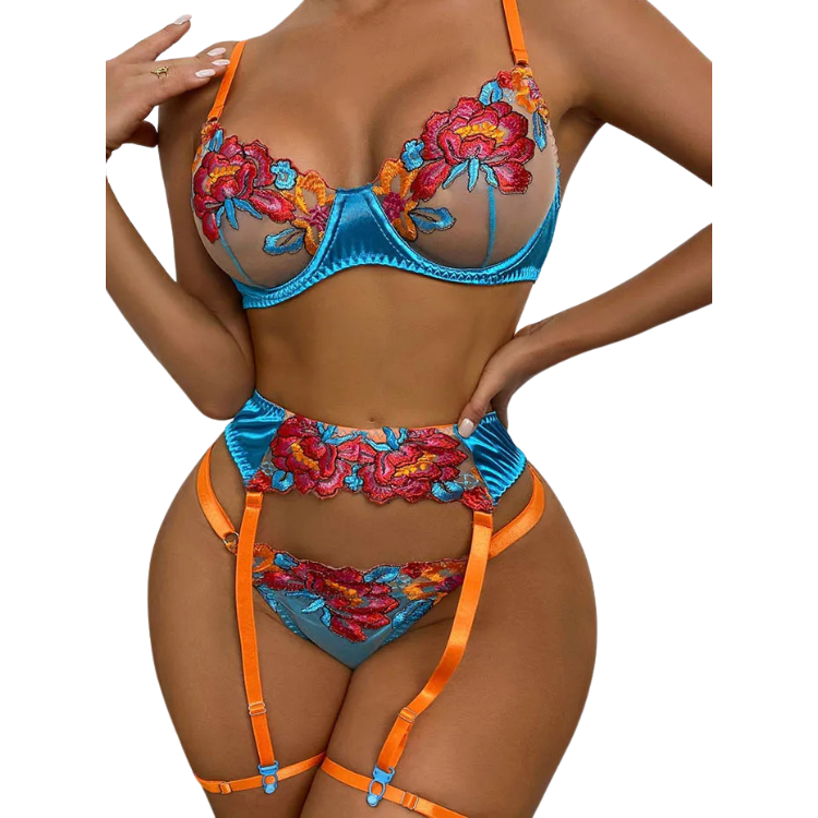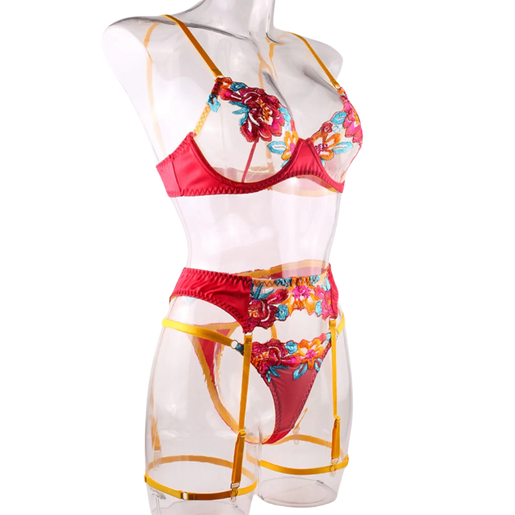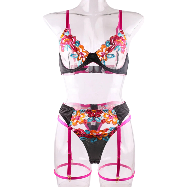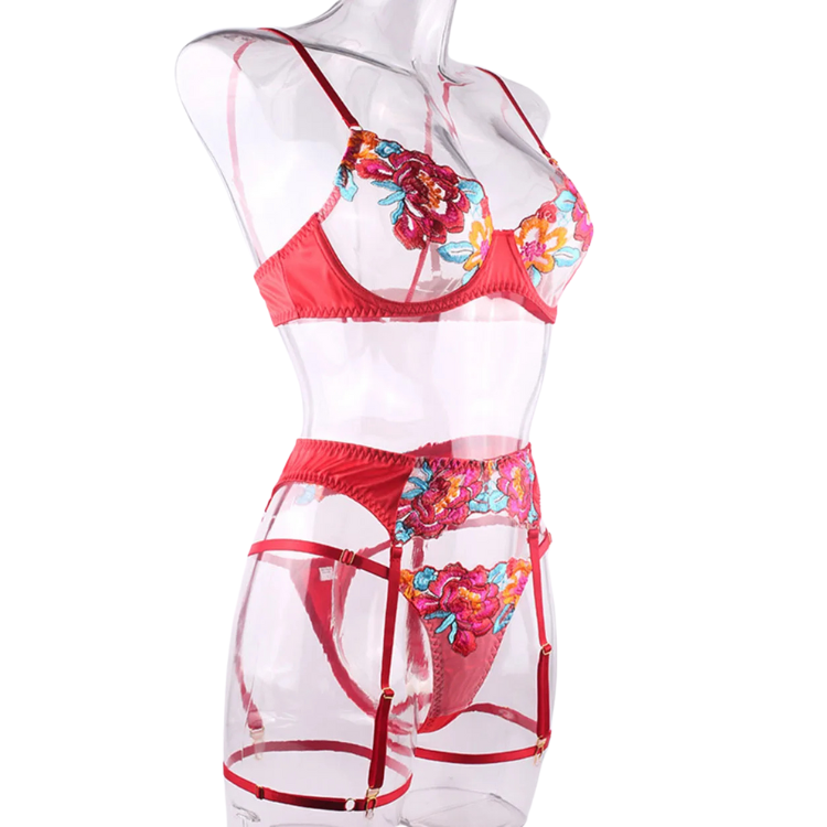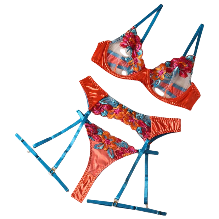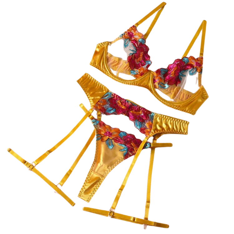 This enchanting ensemble draws inspiration from the delicate dance of flowers in the breeze, transforming that natural elegance into a form-fitting masterpiece that highlights every asset with its intricate lace detailing and flirtatious cutouts. The plunging neckline serves as a bold declaration of confidence, while the whisper-thin lace whispers secrets of nights filled with passion and liberation.