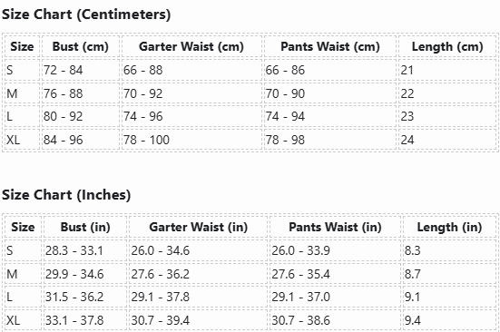 | Size | Bust (cm) | Garter Waist (cm) | Pants Waist (cm) | Length (cm) |