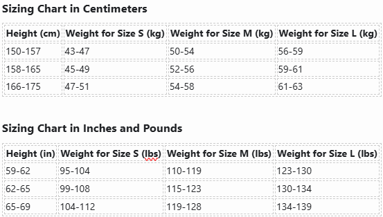 | Height (cm) | Weight for Size S (kg) | Weight for Size M (kg) | Weight for Size L (kg) |