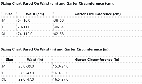 Sizing Chart Based On Waist (cm) and Garter Circumference (cm):