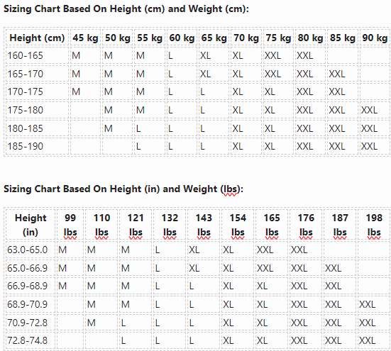 | 175-180 | M | M | L | L | XL | XL | XXL | XXL | XXL | |