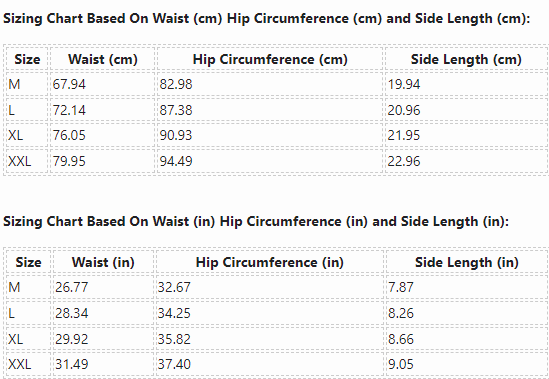 Sizing Chart Based On Waist (cm) Hip Circumference (cm) and Side Length (cm):