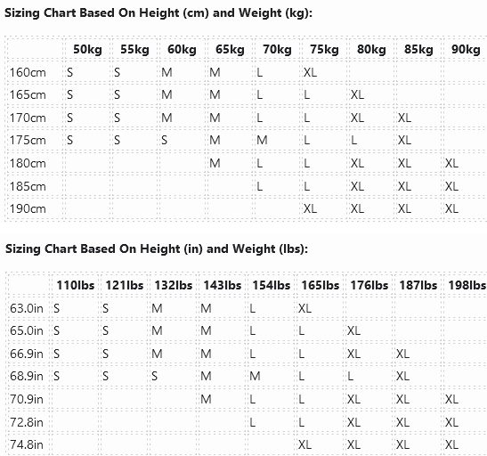 | 175cm | S | S | S | M | M | L | L | XL | |