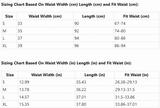 | Size | Waist Width (cm) | Length (cm) | Fit Waist (cm) |