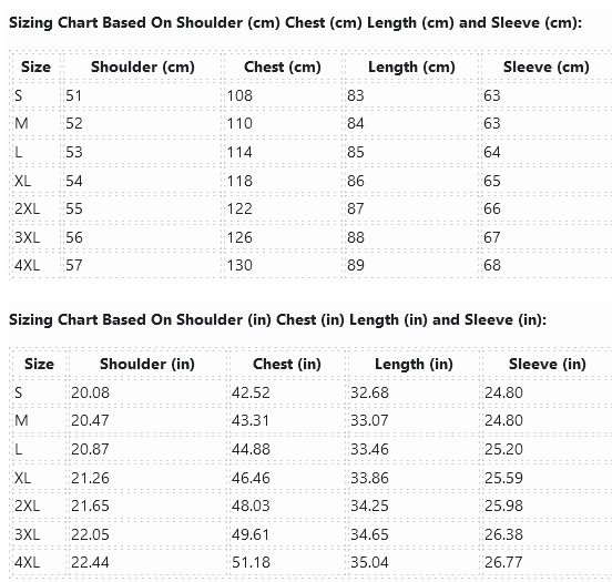 Sizing Chart Based On Shoulder (cm) Chest (cm) Length (cm) and Sleeve (cm):
