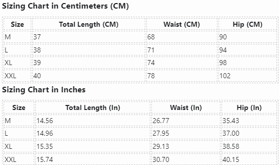 | Size | Total Length (CM) | Waist (CM) | Hip (CM) |