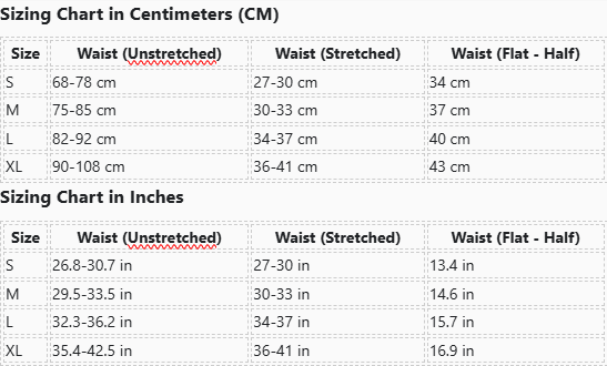 | Size | Waist (Unstretched) | Waist (Stretched) | Waist (Flat - Half) |