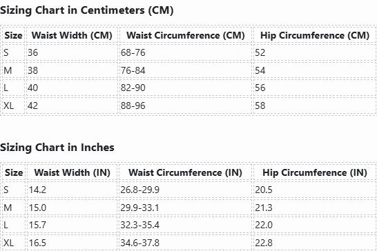 | Size | Waist Width (IN) | Waist Circumference (IN) | Hip Circumference (IN) |