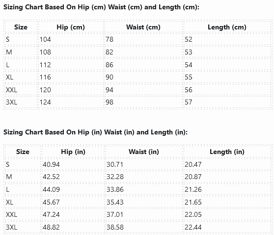 Sizing Chart Based On Hip (cm) Waist (cm) and Length (cm):