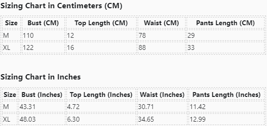 | Size | Bust (CM) | Top Length (CM) | Waist (CM) | Pants Length (CM) |