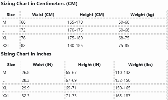 | Size | Waist (CM) | Height (CM) | Weight (kg) |