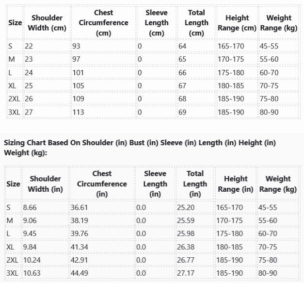 | Size | Shoulder Width (in) | Chest Circumference (in) | Sleeve Length (in) | Total Length (in) | Height Range (in) | Weight Range (kg) |