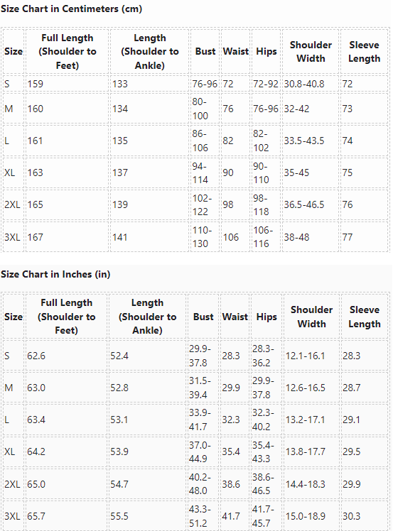 | Size | Full Length (Shoulder to Feet) | Length (Shoulder to Ankle) | Bust | Waist | Hips | Shoulder Width | Sleeve Length |