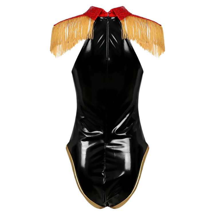 As the master of ceremonies in this eye-catching ensemble, you'll channel the vintage charm of classic ringmasters, while adding a modern, queer twist that’s as bold as it is beautiful. The shimmering polyester fabric catches the light with every movement, casting a spell of allure and mystery around you. Whether you're hosting a grand event or strutting through a festival, this romper ensures you'll hold the audience in the palm of your hand.