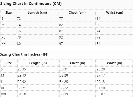 | Size | Length (cm) | Chest (cm) | Waist (cm) |