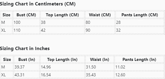 | Size | Bust (CM) | Top Length (CM) | Waist (CM) | Pants Length (CM) |