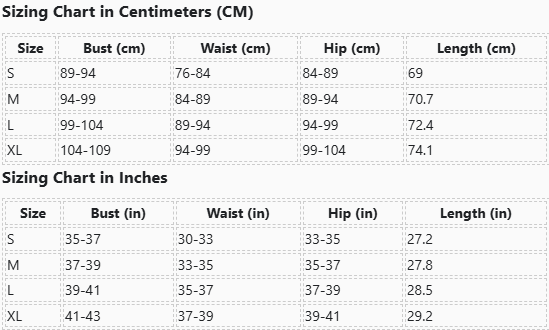 | Size | Bust (in) | Waist (in) | Hip (in) | Length (in) |