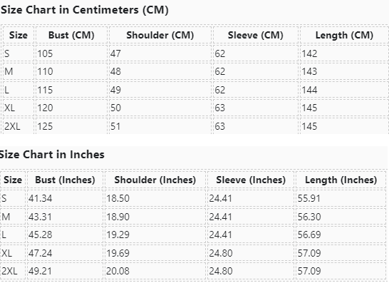 | Size | Bust (CM) | Shoulder (CM) | Sleeve (CM) | Length (CM) |